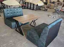 Şirkət90 Azn Kafe/restoran üçün mebel dəsti - 2 ədəd dairəvi masa: ağac teksturalı laminat üstlük, tək sütunlu dayaq və dairəvi əsas. Kiçik məkanlarda rahat yerləşir, servis üçün kifayət qədər səth təqdim edir. - 5 ədəd taburet: