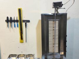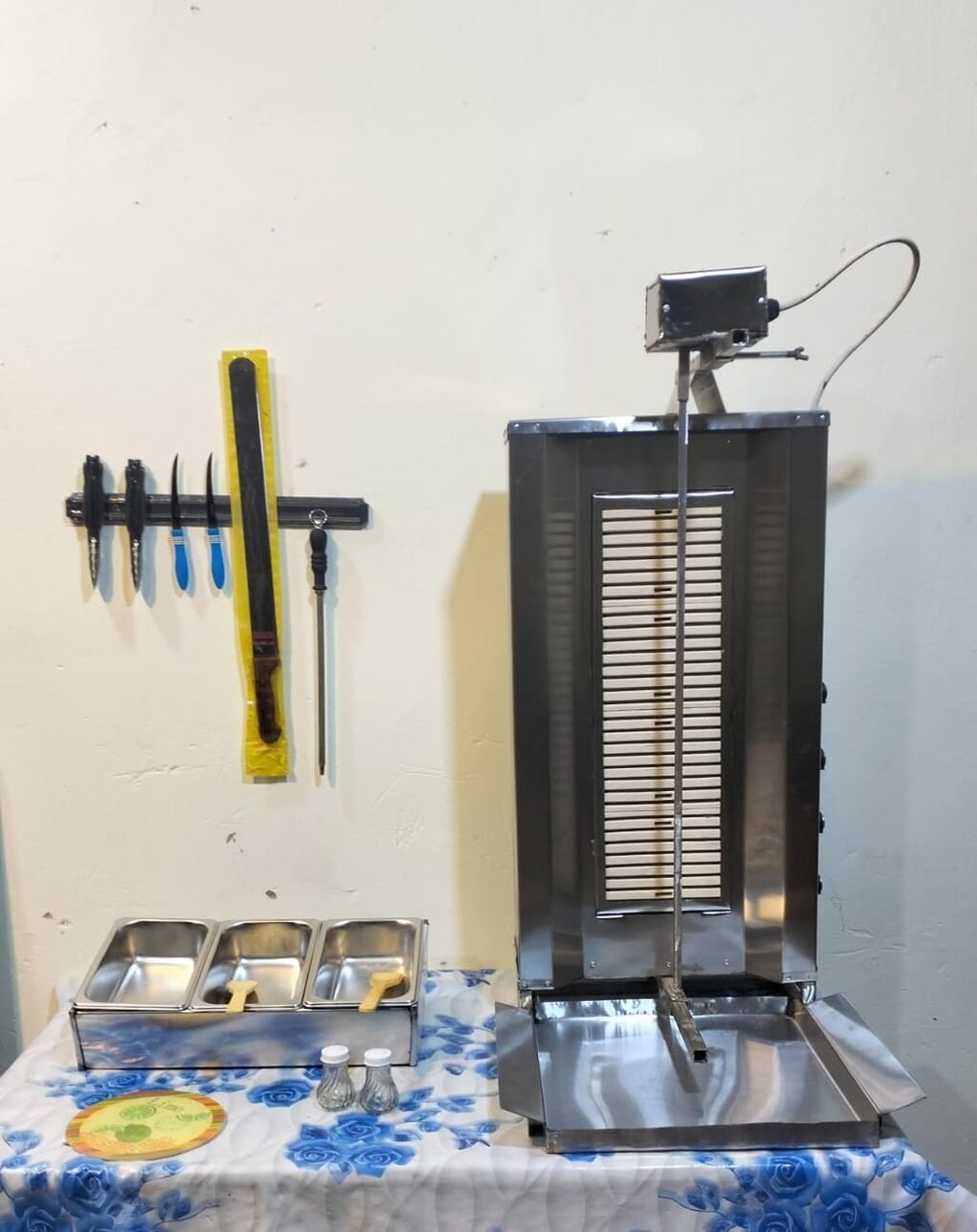 Şirkət305 Azn Donerxana avadanlığı Dönər aparatı Doner aparatı 4 gözlu üsten matorlu Dönər bıçağı təzə Asılqan maqnit Konteyner salat qablari nerj + salat qabi tezgahı nerj Göyərti daskasi spatel Əlavə bıçağlar Naqqaslar Mayonez