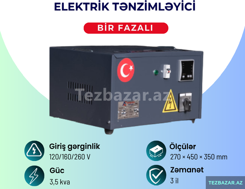 Şirkət3200 Aznİstehsalçı : AKBABA GROUP Fazaların sayı: 3 (üç faza) Güc : 45 kVA Giriş gərginlik : 275 - 450 Volt Çıkış gərginlik: 380 Zəmanət: 3 il