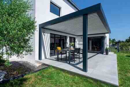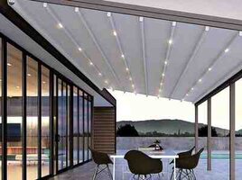 Şirkət125 Azn - Tavan: Alüminium lamellərdən ibarət bioklimatik konstruksiya; lamellər xətti şəkildə düzülüb, yağış suyu yönləndirmə kanalları ilə inteqrasiya olunur. - İdarəetmə: Avtomatik açılıb-bağlanma və bucaq tənzimlənməsi üçün