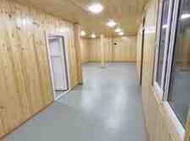 - Döşəmə bərk, asan yuyulan səthlə (sənaye tipli boya/linolyum görünüşlü).