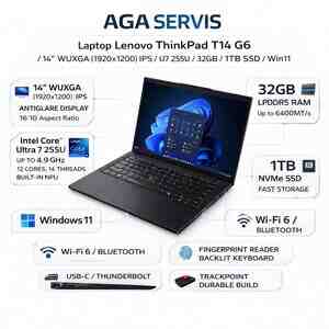 850 Azn Lenovo ThinkPad T14 Gen 5 32/512 Prosessor: Intel® Core Ultra 7 155U – 12 nüvə, 14 Thread, Turbo 4.8 GHz Yaddaş: 32GB DDR5, 2x SODIMM (5600MHz) Disk: 512GB NVMe PCIe Gen4 Ekran: 14" WUXGA (1920 x 1200) IPS,