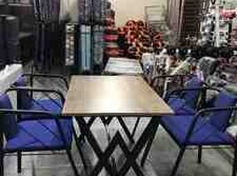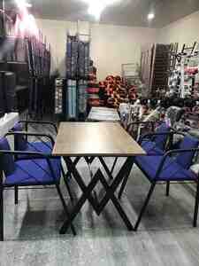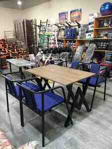 - oturacaqlar: 4 ədəd, qara metal karkas, yüngül və möhkəm. Oturacaq və arxalıq mavi rəngli yumşaq yastıqlarla. Açıq qol dayaqları və dekorativ metal xəttlərlə müasir görünüş.