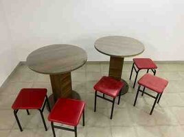 - 5 ədəd taburet: qara metal karkas, qırmızı vinil/deri oturacaq. Yığcam və yüngül, masaların ətrafında rahat düzülür.