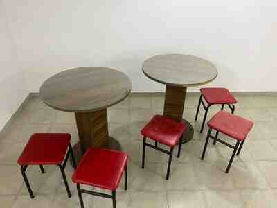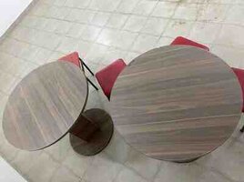 - 2 ədəd dairəvi masa: ağac teksturalı laminat üstlük, tək sütunlu dayaq və dairəvi əsas. Kiçik məkanlarda rahat yerləşir, servis üçün kifayət qədər səth təqdim edir.