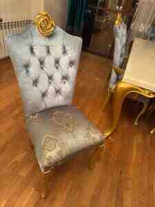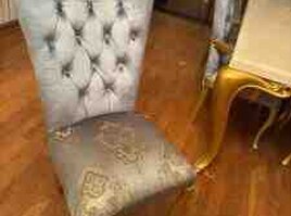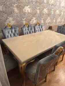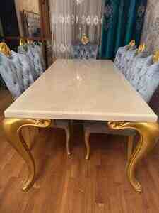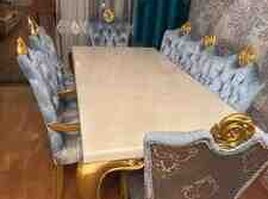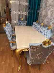 Masa və stullar premium dizayndadır, qızılı oyma ayaqları və məxmər (velvet) kapiton stulları ilə interyerə xüsusi gözəllik verir.