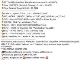 900 Azn Masaüstü Gaming PC DDR5 Qeyd : sadəcə WhatsApp ilə əlaqə CPU:i7-12700KF GPU: 4060ti 16GB RAM : 32GB DDR5 SSD : 1TB nv.me Mainboard : h610-h2/M.2 D5 Manitor: 25inch 200HZ Gaming qulaqliq keyboard: Blic t60 red swcith
