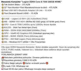 379 Azn UniSet Electronic _Etibarlı Masaüstü Kompüterlər Yalnız Bizdə_ _BiR KART 2-3-6-9-12-18-24 ay TAM KART TAKSITLE_ Satış Nağd və Köçürmə ilə Mümkündur Satış Mağazada Aparilır Model: Legion Cpu: intel i3-7th;8th Ram: