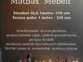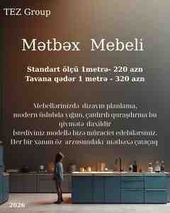 440 Azn Mebeldə keyfiyyət, zövq və rahatlıq bir arada! Mətbəx, yataq otağı, qonaq otağı və uşaq otağı üçün istədiyiniz modeldə və ölçüdə mebellər sifarişlə hazırlanır! İstəyə uyğun dizayn Yüksək keyfiyyətli material Çatdırılma
