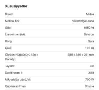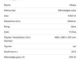 Mağaza305 Azn Willz mikrodalgali soba ankastre Turkiye istehsali 20ltre bio şüşe 700 Wat 8 proqram Seviyye guc ayari Ozunu temizleme var Mexanik tenzimleme Buz eritme var Tam bishirme var Rengi qara seri ag var Yenidir say