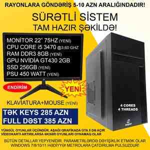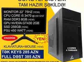 1899 Azn Oyun üçün Kompüter "RGB Core i5 3470 GT430 2GB 256GB SSD" Tək Sistem Bloku – 370 AZN yox 329 AZN 22" Yeni Monitor+Yeni Klaviatura/mouse-la dəst – 470 AZN yox 429 AZN Yeni USB WIFI+Bluetooth Adapter