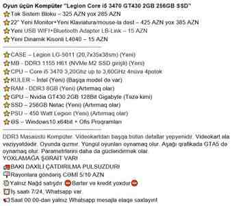 DDR3 Masaüstü Kompüter. Videokartdan başqa bütün detallar yepyenidir. Videokart əla vəziyyətdədir. Oyunda qızmır. Yüngül oyunları oynamaq olur. Aşağı qrafikada GTA5 də oynamaq olur. Parametrlərini daha da gücləndirmək olar.