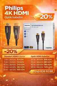 Satışda orijinal Philips 4K HDMI kabellər mövcuddur. Yüksək keyfiyyətli görüntü və sürətli məlumat ötürülməsi üçün idealdır. Proyektor, televizor, monitor, PlayStation, Xbox və digər HDMI cihazları üçün istifadə olunur.