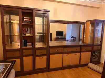 - Tərkibi: böyük divar modulu (şkaf-vitrinlər, açıq rəflər, geniş güzgülü konsol və çoxsaylı çekmecələr/şkaf qapıları) və ayrıca TV stendi.