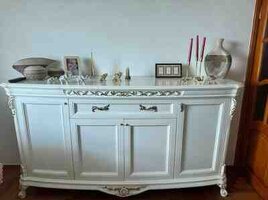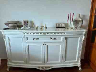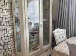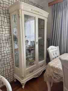 1800 Azn Klassik üslubda dəst mebel Masin Boyasi - Rəng: krem-ağ, zərif qızılı dekor və fitinqlər - Material: parlaq (high‑gloss) səthli MDF/LDSP tipli lövhə, şüşə vitrin qapıları, metal qızılı tutacaqlar və ayaqlar Dəst
