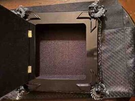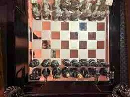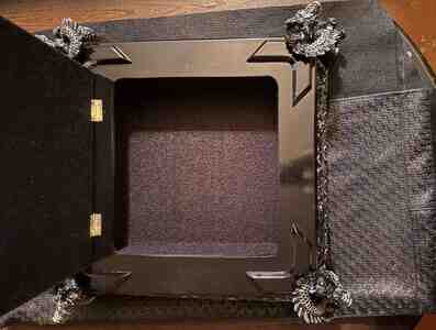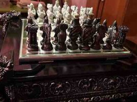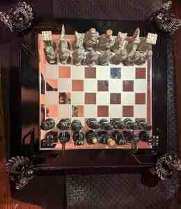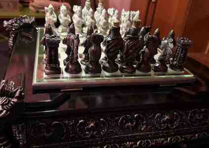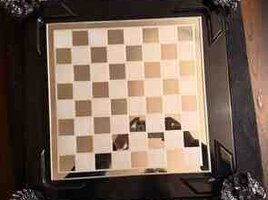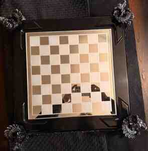 - Dizayn: Qara laklı korpus, bəzəkli relyef naxışlar və hər küncdə heykəltəraşlıq üslubunda dekorativ baş fiqurları. Şüşə/güzgü effekti olan şahmat lövhəsi (ağ-gümüş və tünd kvadratlar).