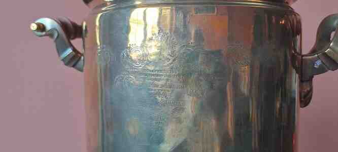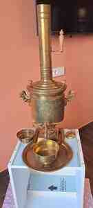 Bataşev Fabrikinin 1888-ci il istehsalı qədim samovarı. Həm gövdəsində, həm qapağında, həm də ayaq hissəsində medalları var. Podnosu, stəkan yumaq üçün qabı, bacası və bacanın qapağı da var.