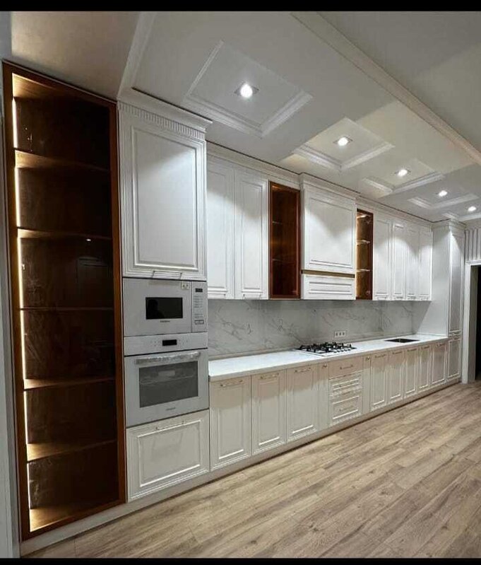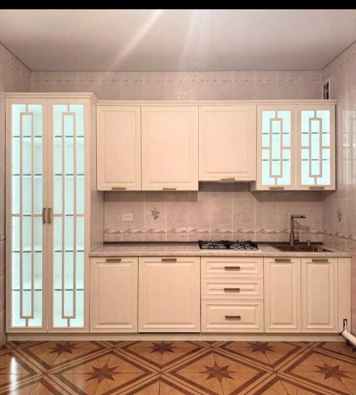 Hər bir dolab, qab-qab qapağı, rəflər və iş səthləri, gigiyena, funksionallıq və estetikanı birləşdirən bir ahəng yaratmaq üçün düşünülmüşdür. Keyfiyyətli taxta, yumşaq rənglər, zərif detallar — hamısı birlikdə mətbəxi evin ürəyinə çevirir. Günəş işığında parlayan rəflər, isti tonlarda işlənmiş mebel ağacının illər boyu davam edəcək dostluğu simvoludur.