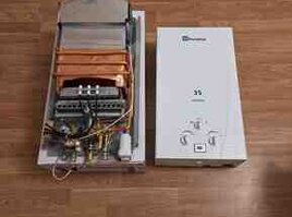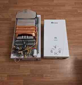 - İdarəetmə: ön paneldə 3 çevirmə düyməsi – alov gücü, su axını/temperatur tənzimləməsi; kiçik rəqəmsal göstərici