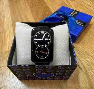 Qutunun daxilində saat yastıqcıq üzərində təqdim olunur, göy lentli hədiyyə qutusu vizualda mövcuddur. Dizayn yığcam, çərçivələr nazik, ekranda yüksək kontrastlı göstəricilər. İdman, gündəlik istifadə və klassik üslubda saat üzü seçimləri ilə həm funksional, həm də zərif görünüş.