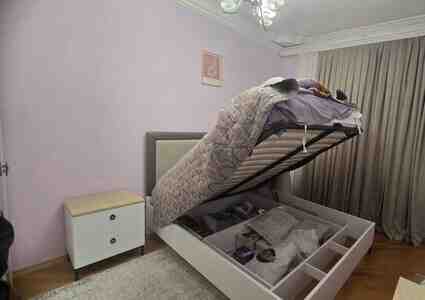- İkinəfərlik yataq çarpayısı: Yumşaq başlıq (boz/bez rəng çalarları), şaquli tikişli panel, möhkəm karkas. Qaldırılan mexanizmli bazalı modeldir – iç hissəsi bölmələrə ayrılmış geniş saxlama yeri ilə.